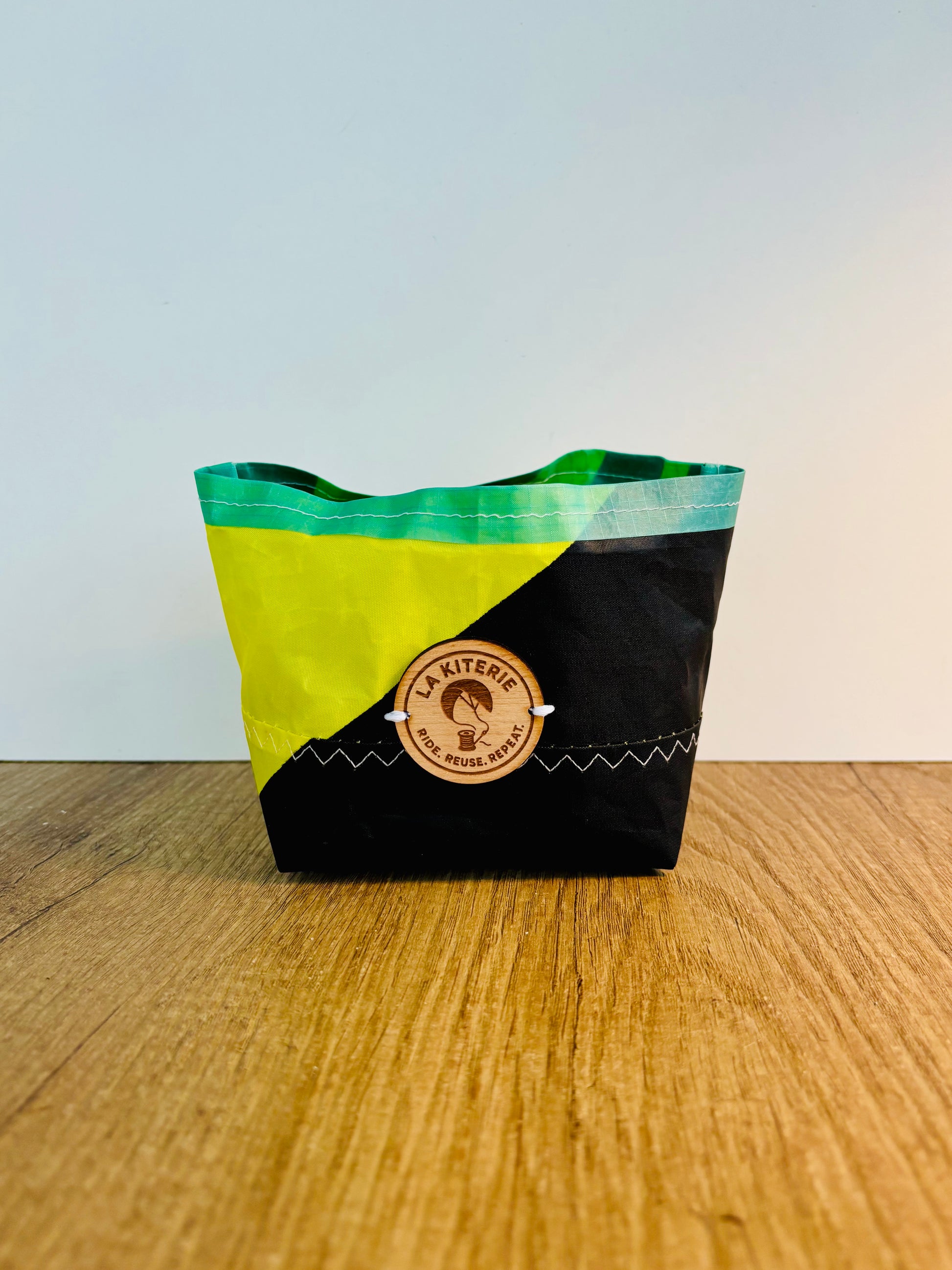 Les bacs à marée sont tous fabriqués à partir d'ailes de Kitesurf recyclées ainsi que du logo gravé sur bois. pour une dimension de 10 cm x 10 cm x 10 cm.