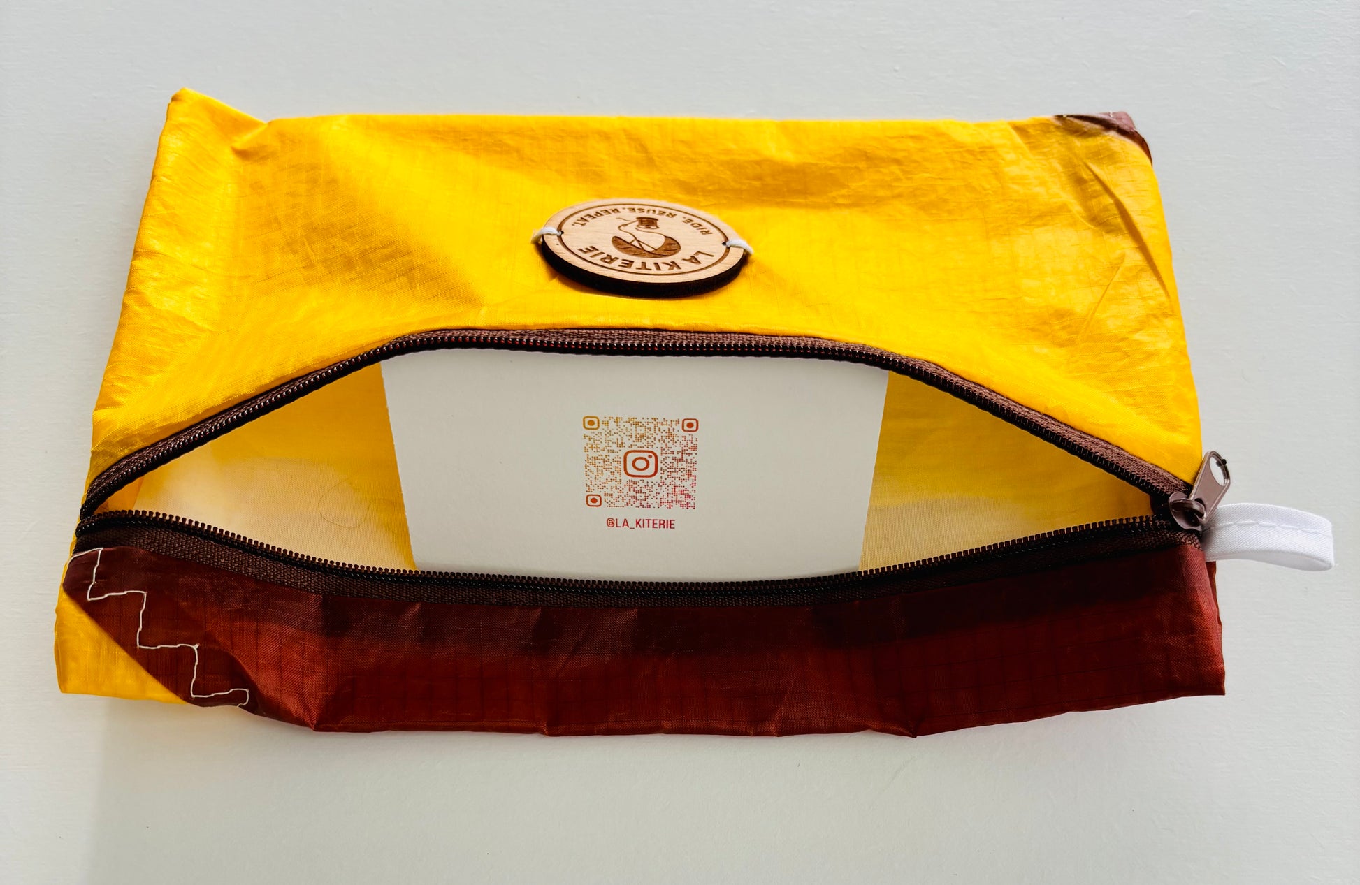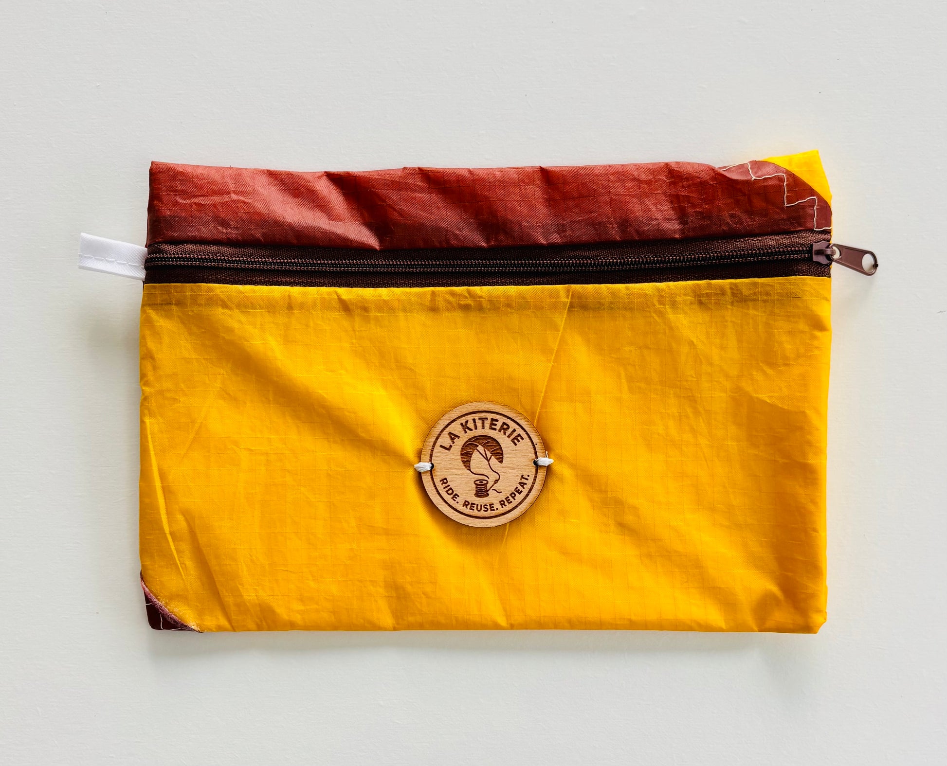 Les pochettes Fontenelles sont toutes fabriquées à partir d'ailes recyclées, doublée de coton, d'un Zip coloré, logo gravé sur bois pour une dimension de 21 cm x 14 cm.
