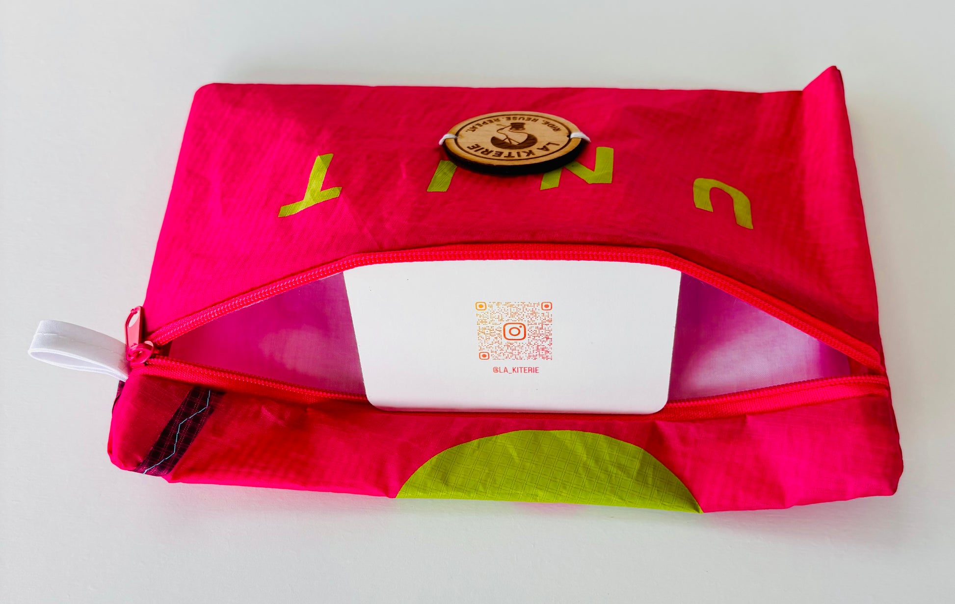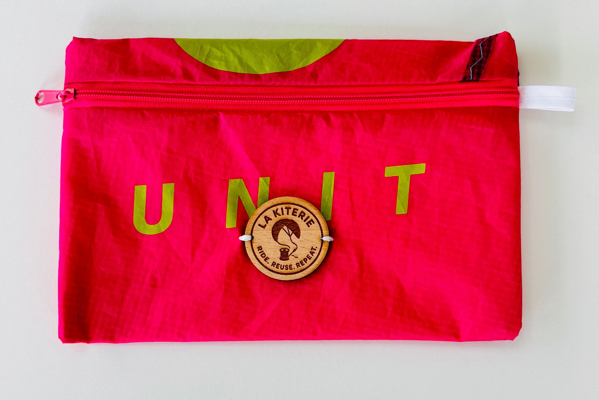 Les pochettes Fontenelles sont toutes fabriquées à partir d'ailes recyclées, doublée de coton, d'un Zip coloré, logo gravé sur bois pour une dimension de 21 cm x 14 cm.