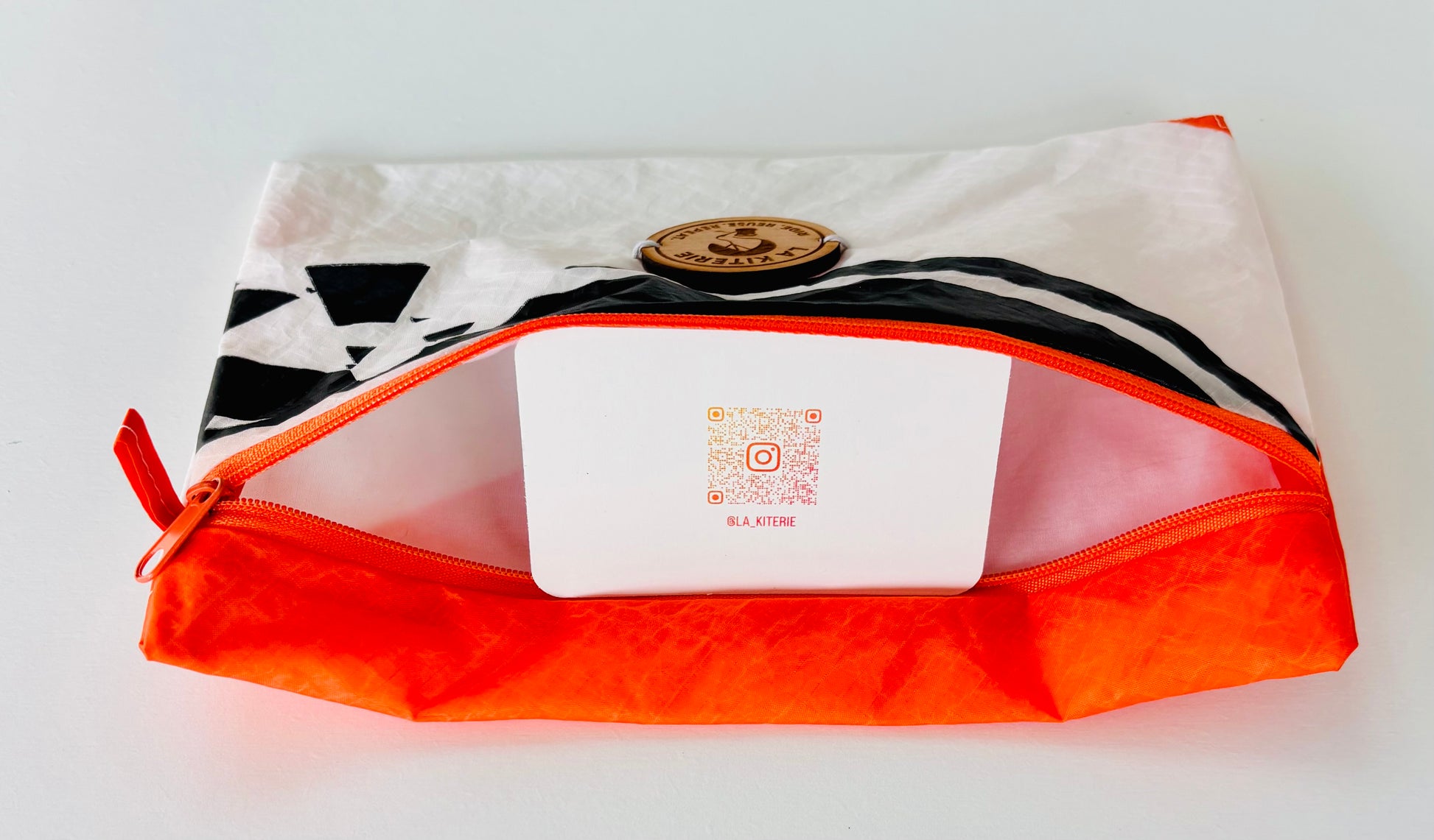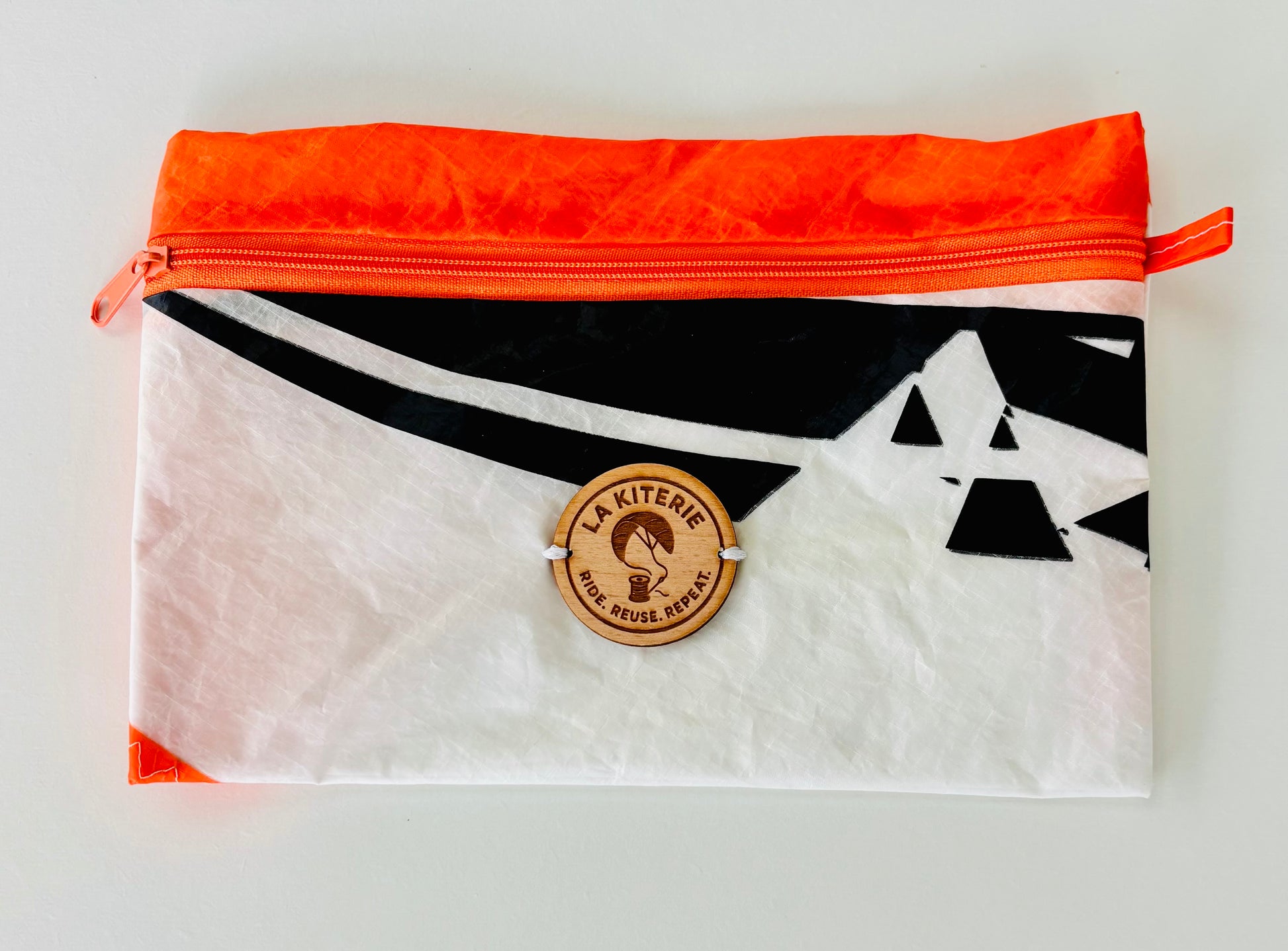 Les pochettes Fontenelles sont toutes fabriquées à partir d'ailes recyclées, doublée de coton, d'un Zip coloré, logo gravé sur bois pour une dimension de 21 cm x 14 cm.