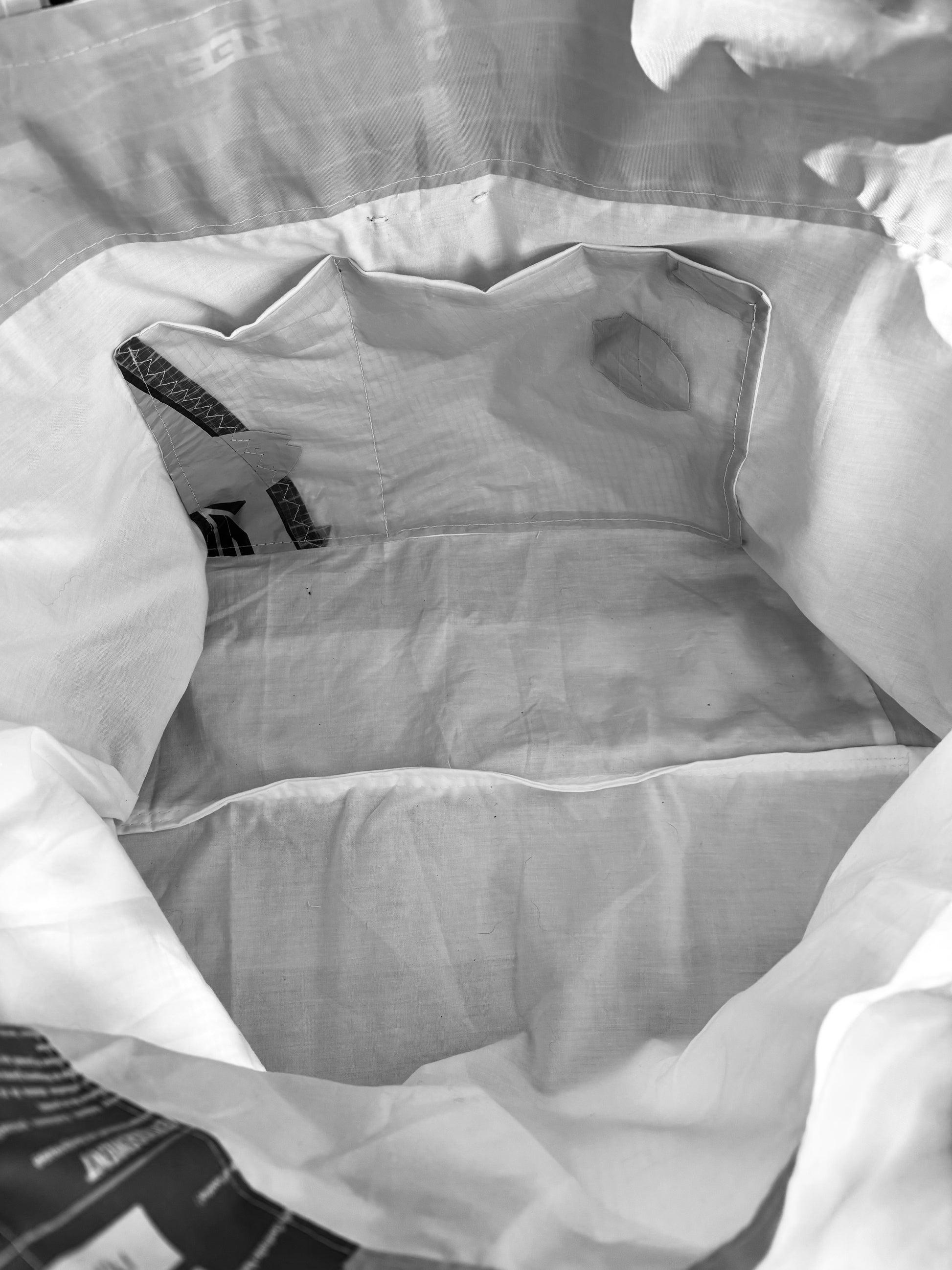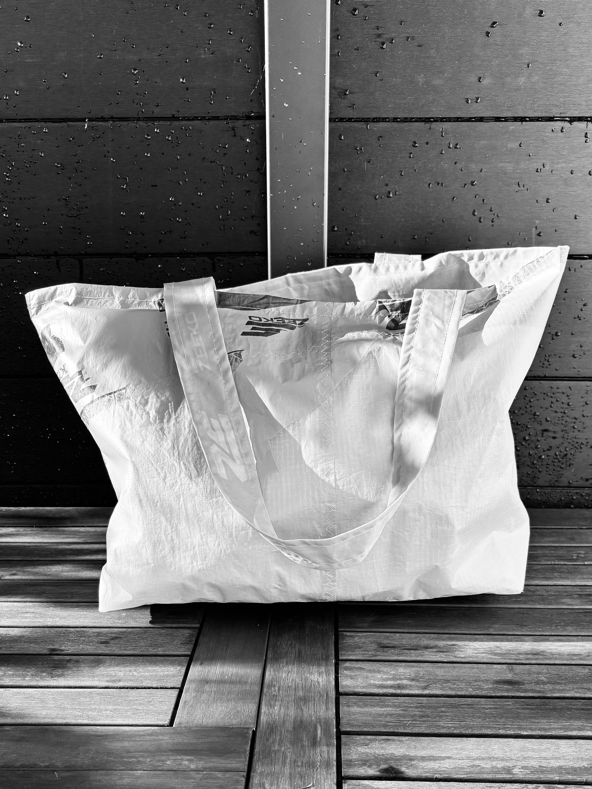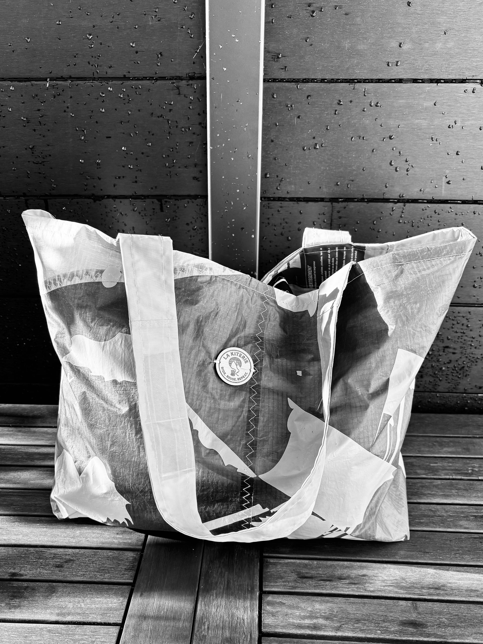 Chaque jusant est fabriqué à partir d'ailes recyclées, doublé de coton, ainsi que du logo gravé sur bois pour une dimension (hors anses) de 60 cm x 40 cm.