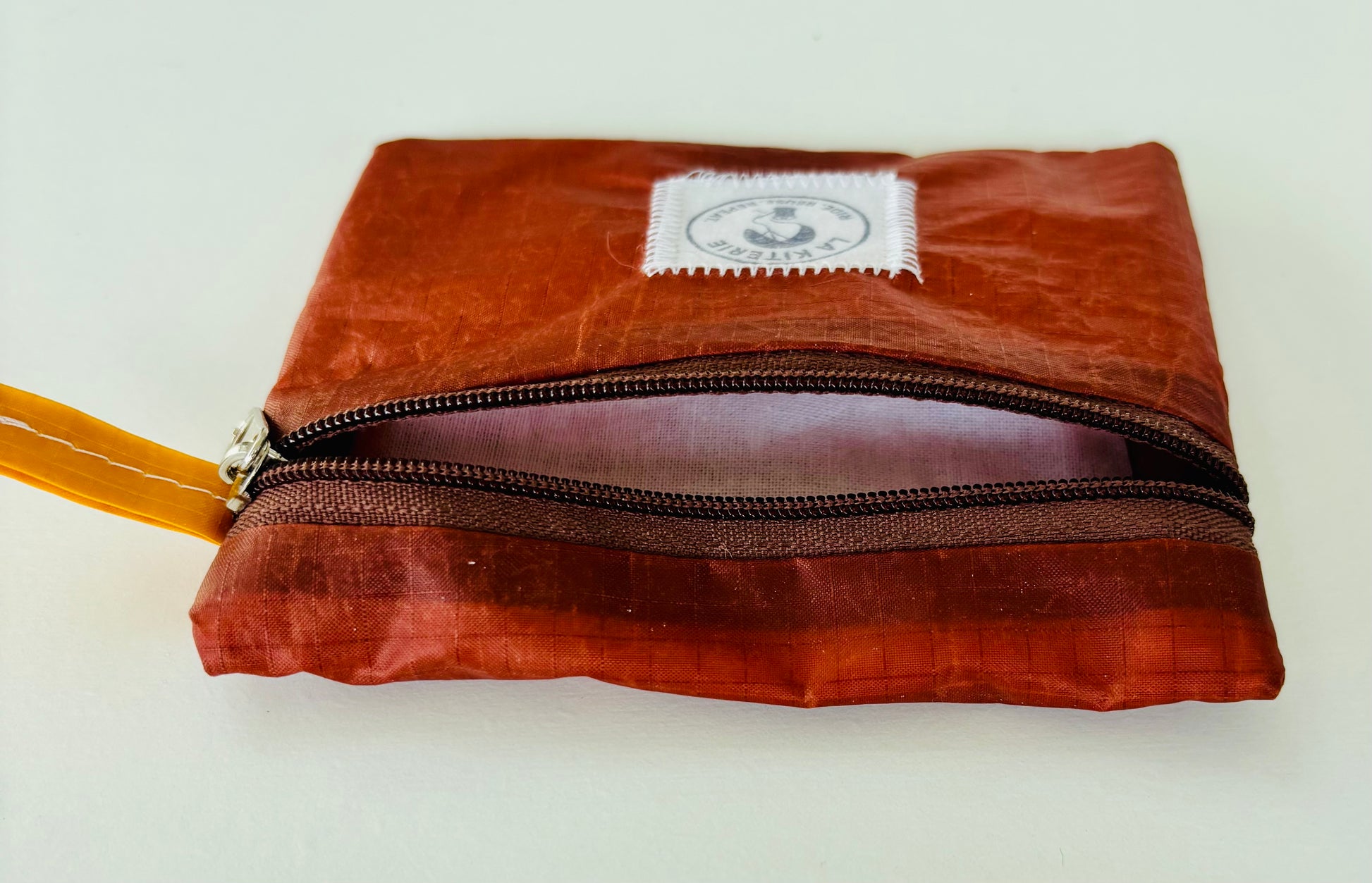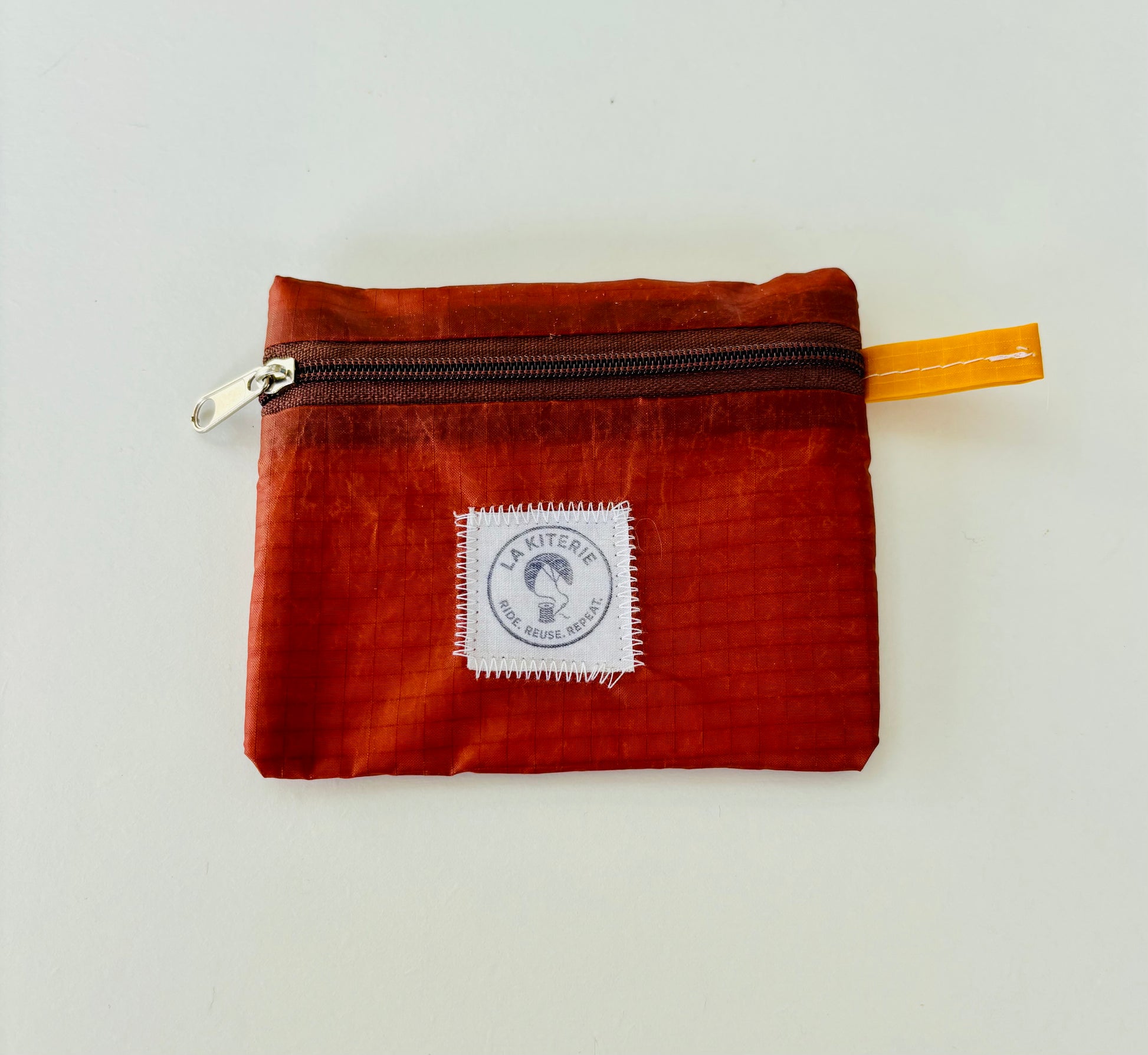 Les Misaines sont toutes fabriquées à partir d’ailes recyclées, doublé de coton, d’un zip coloré, du logo imprimé sur coton pour une dimension de 12 cm x 10 cm.