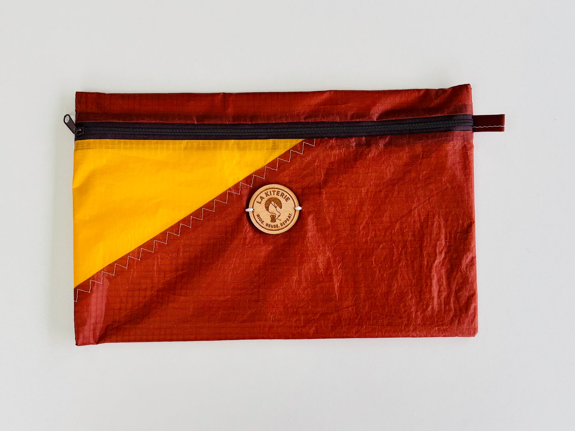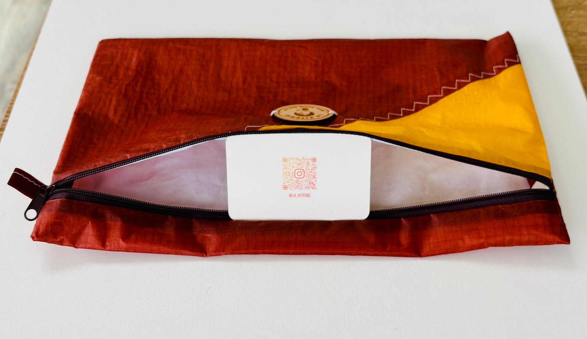 Les pochettes mouclières sont toutes fabriquées à partir d'ailes de Kitesurf recyclées, doublées de coton, d'un Zip coloré ainsi que du logo gravé sur bois pour une dimension de 20 cm x 31 cm.