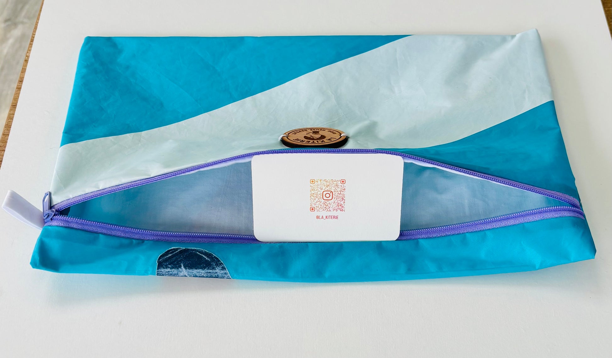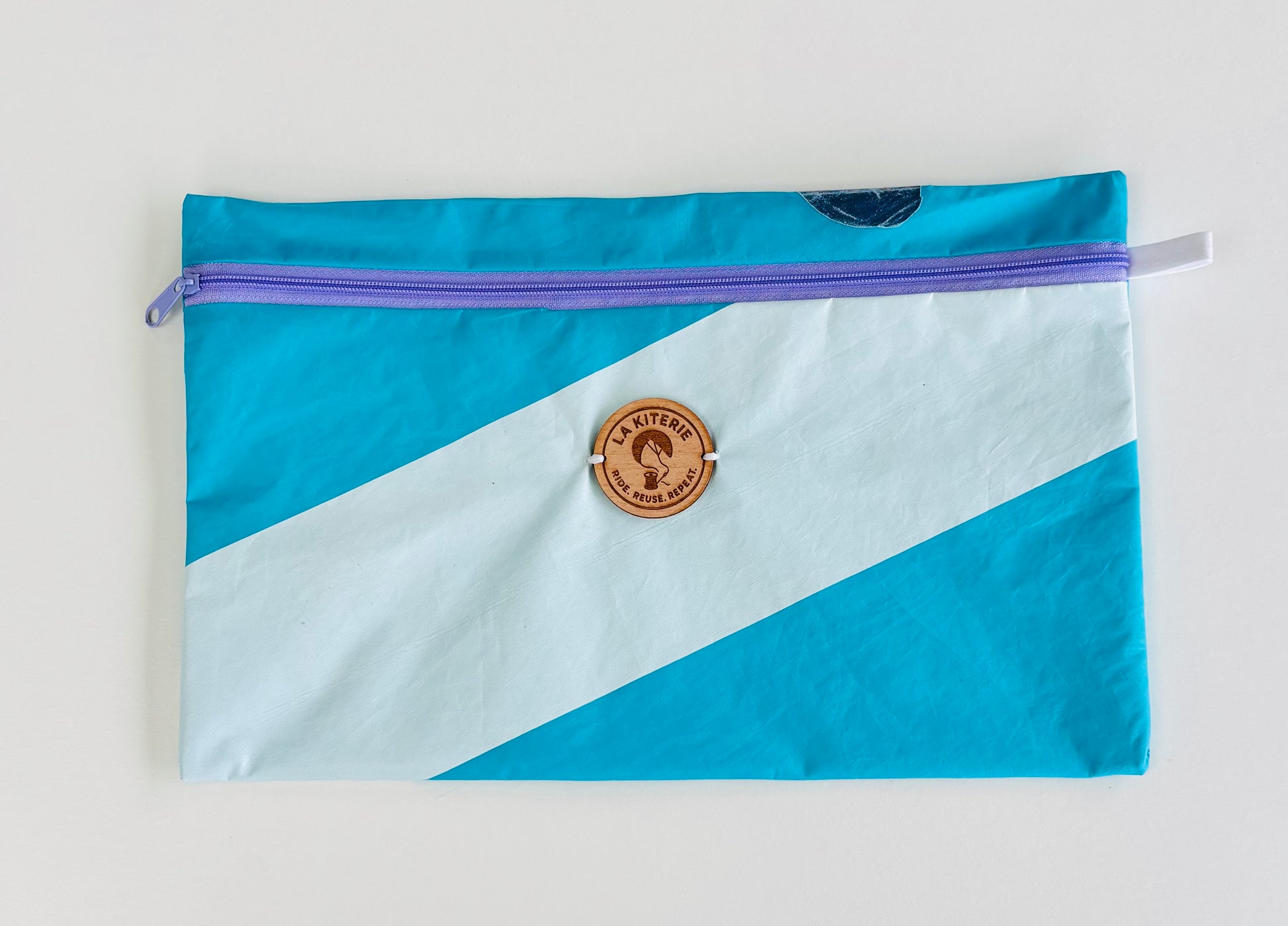 Les pochettes mouclières sont toutes fabriquées à partir d'ailes de Kitesurf recyclées, doublées de coton, d'un Zip coloré ainsi que du logo gravé sur bois pour une dimension de 20 cm x 31 cm.