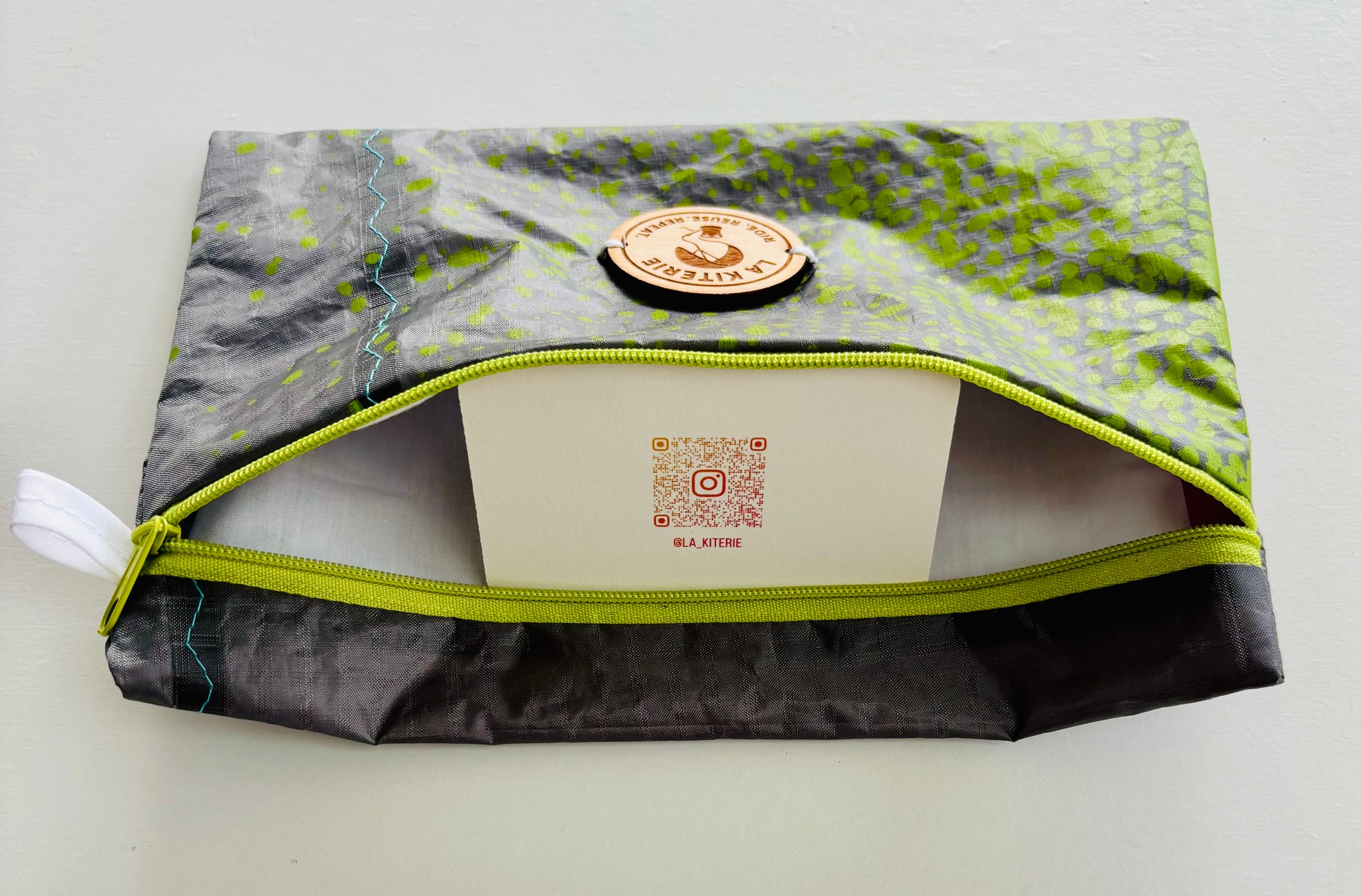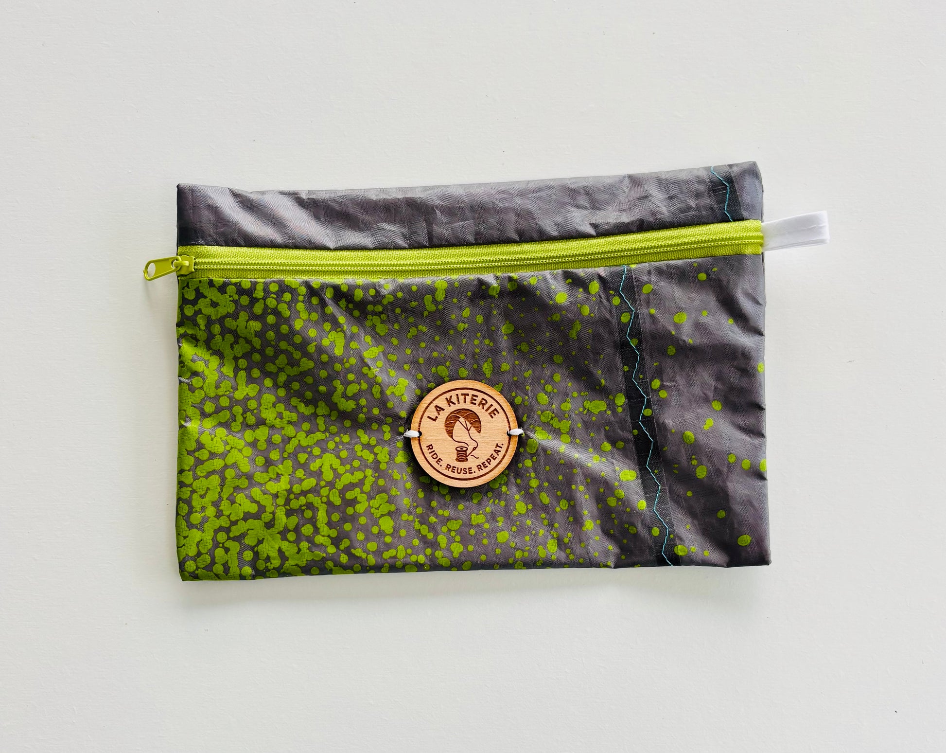 Les pochettes Fontenelles sont toutes fabriquées à partir d'ailes recyclées, doublée de coton, d'un Zip coloré, logo gravé sur bois pour une dimension de 21 cm x 14 cm.