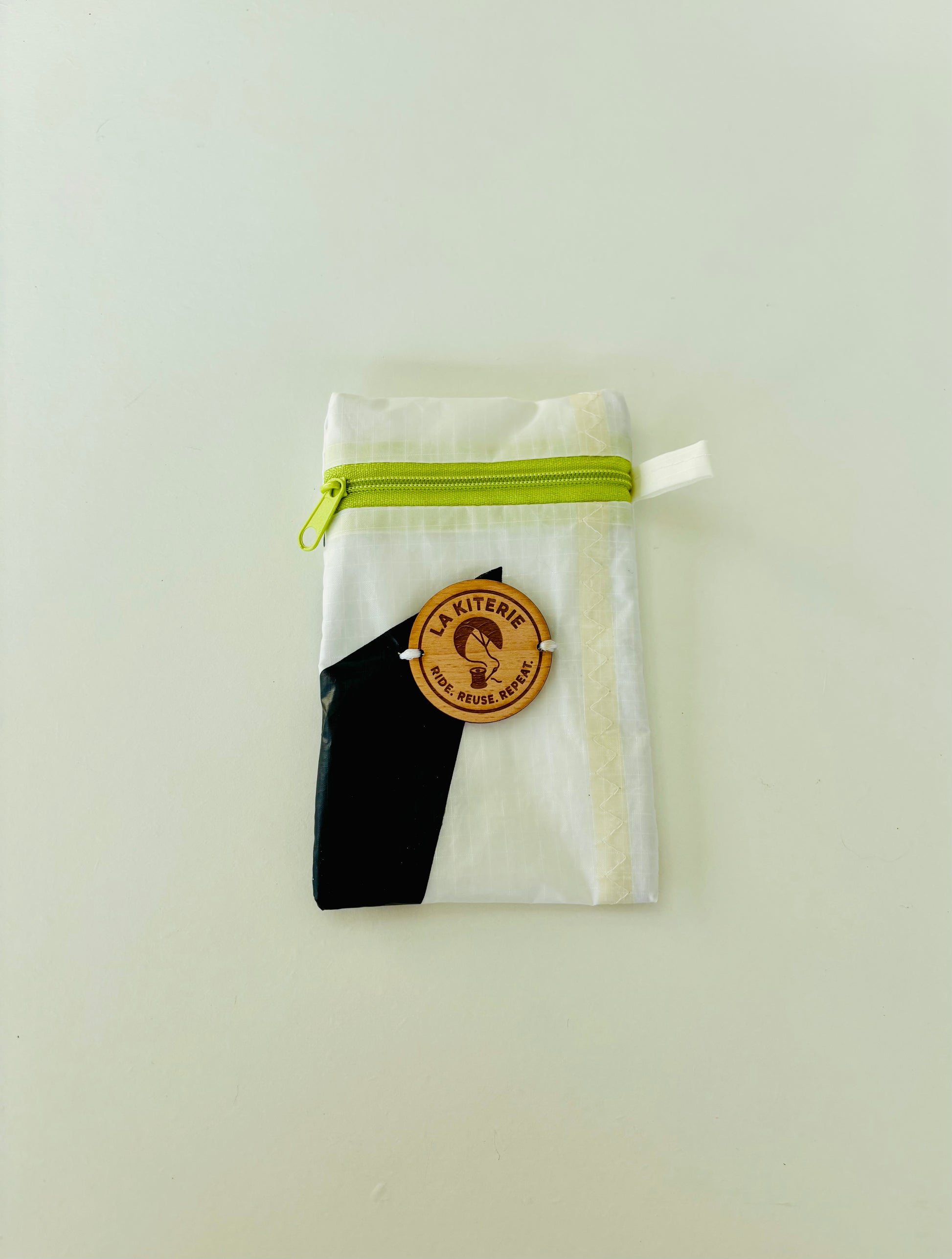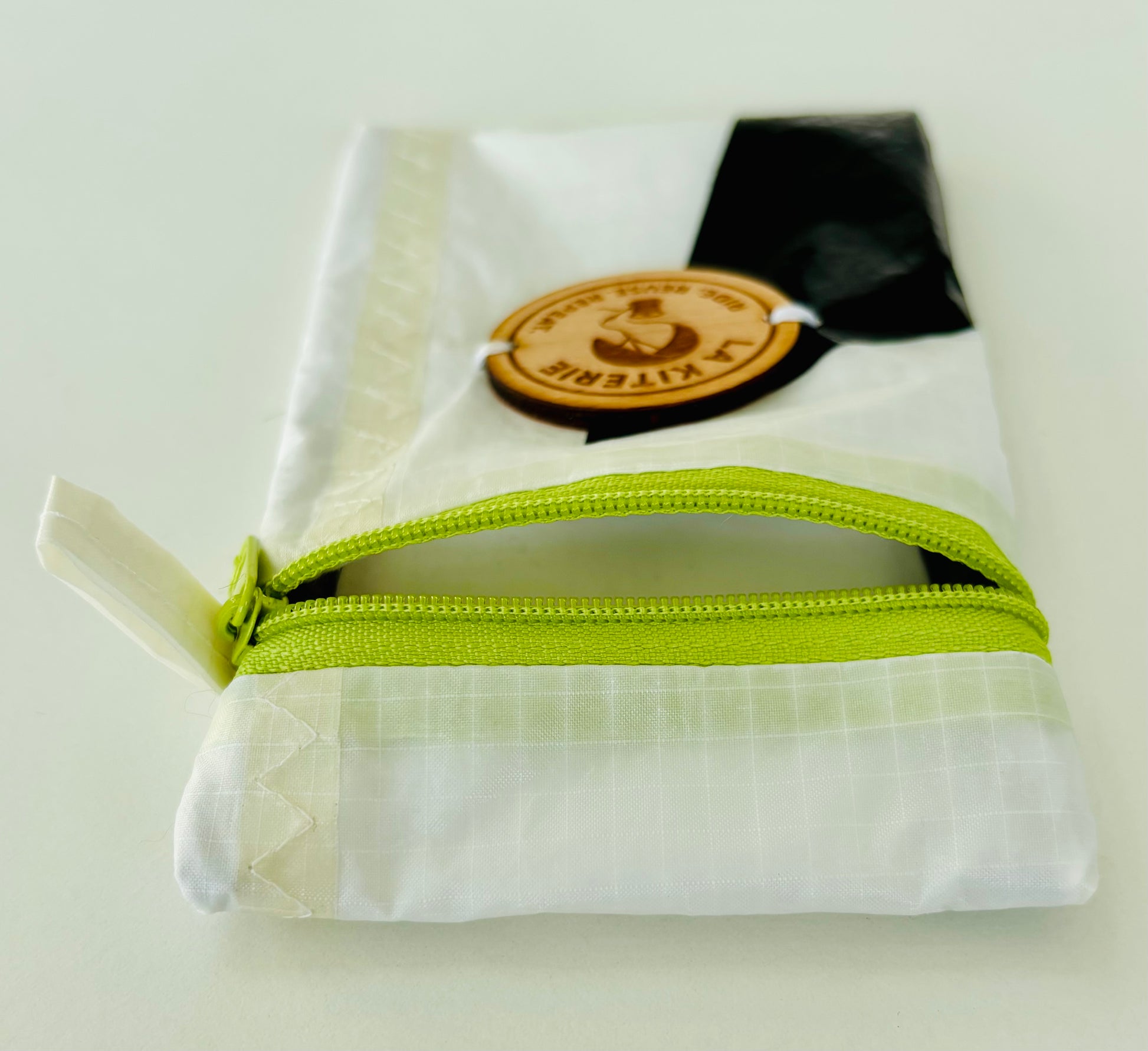 Les pochettes Sablières sont toutes fabriquées à partir d'aile de kitesurf recyclée, doublée de coton, d'un Zip coloré ainsi que du logo gravé sur bois de dimension 14 cm x 9 cm.
