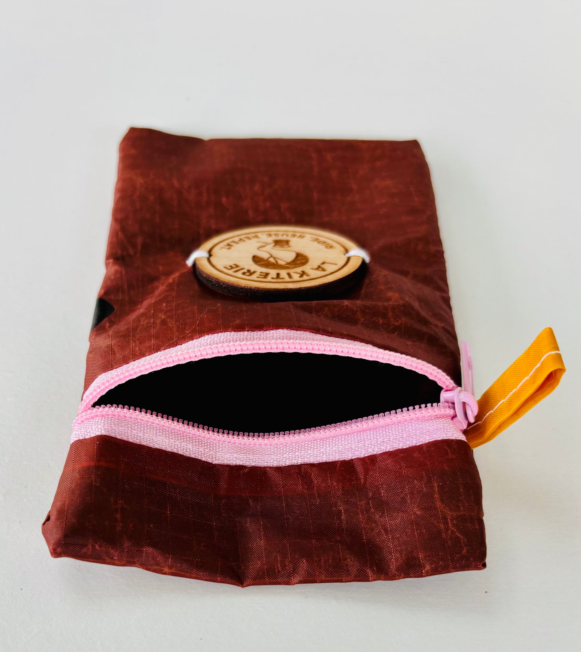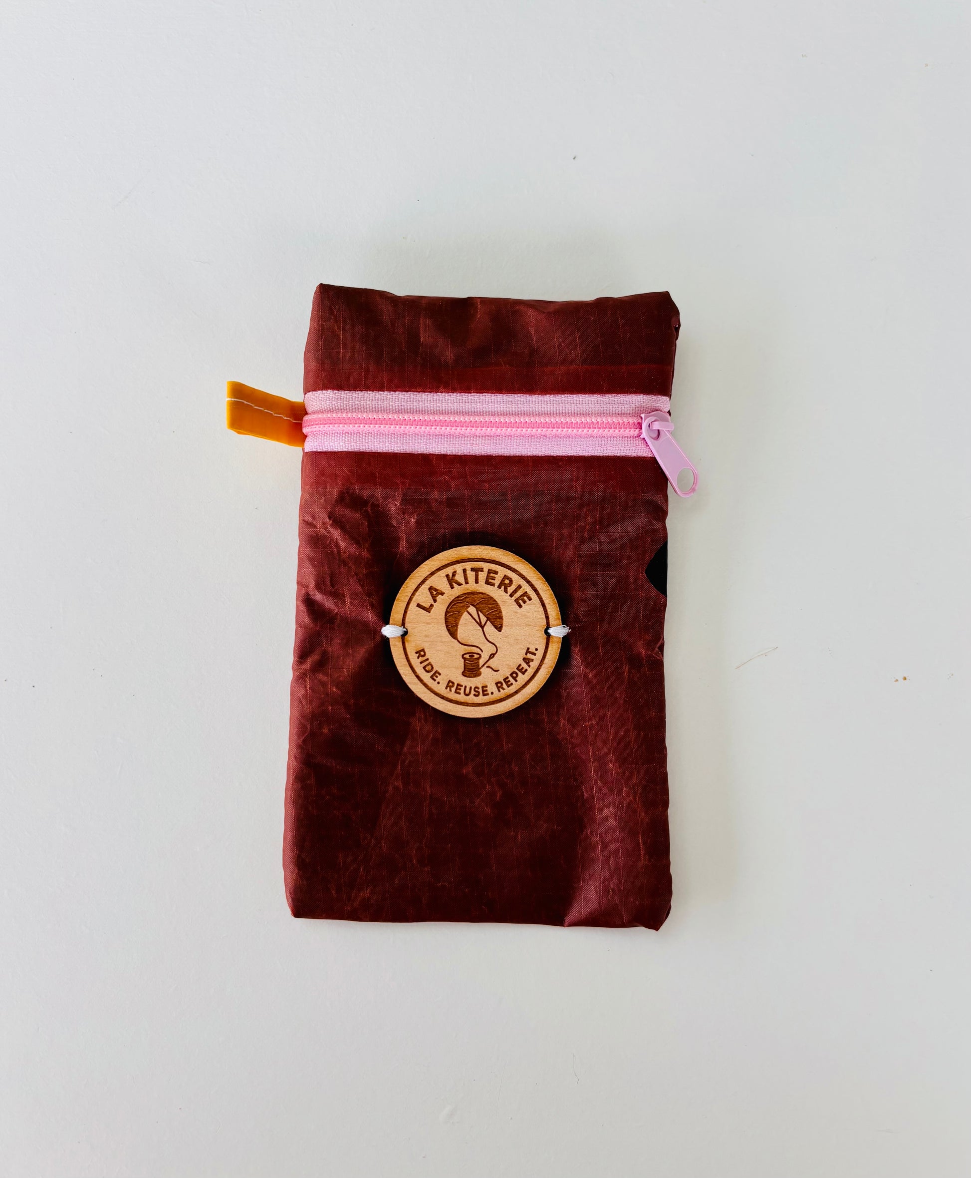 Les pochettes Sablières sont toutes fabriquées à partir d'aile de kitesurf recyclée, doublée de coton, d'un Zip coloré ainsi que du logo gravé sur bois de dimension 14 cm x 9 cm.